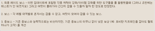 テストサーバーのユーザー達を対象にする 1.9 アップデートテストであるだけに適当なバランシング調整をすることは良いです.しかしとても力強ければモンスターを取る意慾を出すことができないだろうし,また補償がしがなければ誰も捜さないレイドになるでしょう.