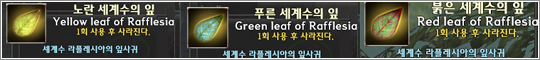 レイド部屋ラッフレシアを入って行こうとすれば世界数の葉 3種セットを求めなければなりません.世界数の葉はウスティウル 1区域モンスターたちがドロップをして,3 種類皆あるとワープゲートが開かれるようになるので皆集めておくようにします.