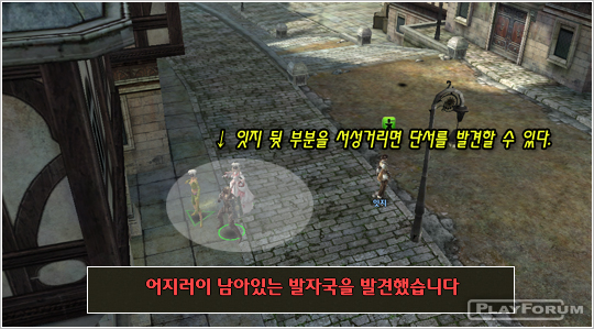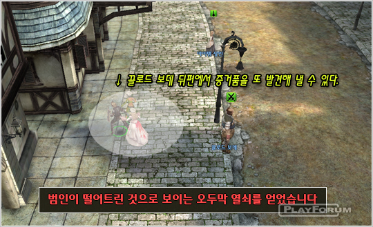 グルトルデが質問することにまじめに答えるイッジ.イッジが現場を保存しているという話にグルトルデは誉めながらイッジ周りを捜してみなさいと言います.イッジ後部分をぶらついて見るようにしましょう.クエストウィンドウが更新されて証拠品 1号の足跡を捜し出すことができます.