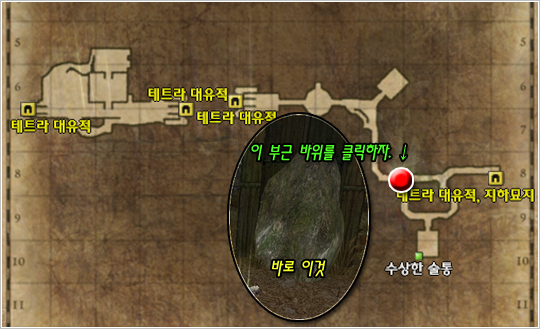 上のテトラ大歩廊の指導に表示されているあの部分に岩が存在します.その岩をクリックすればグルトルデが今一度組んだ~ して登場して,証拠品 2 小屋鍵で門を取って泥棒アジトに入るようになります.