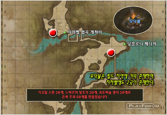 三種類クエストアイテムを皆集めたらイッジに受けたふいごを利用して近くに存在するたき火に行ってシルバー株塊を作らなければなりません.たき火はフィールド多くの箇所で見られるし,たき火一つや二つだけ通うようになればふいごを利用してシルバー株塊を作ることができます.