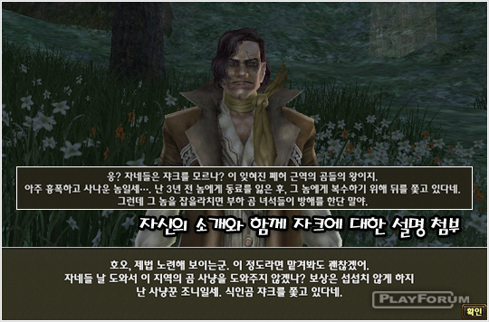 ゾウニは自分がシックインゴムジャクを取るためにここまで追って来たが姿を現わさない状態であり,部下熊たち(マルゴプ,ザルゴプ)が多くて捜索に邪魔になるという理由で自分を手伝ってモンスターたちを片付けてくれと言うお願いをするようになります.