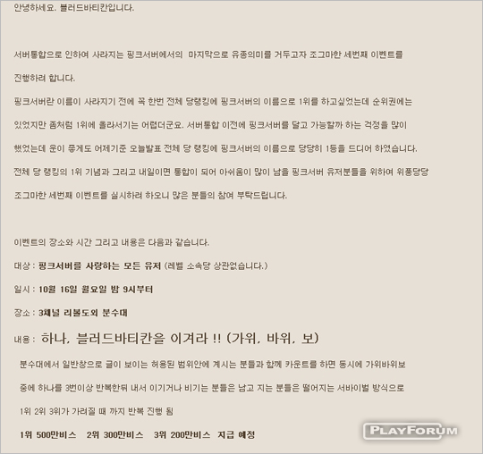 サーバー統合を控えて数日前から 'サーバー全体のイベントを一度開催して見よう'という公式ホームページピンクサーバー掲示板のユーザーの文とともにサーバー統合直前イベントを開催しようという雰囲気が最高に高まった.わずか何時間控えて 10月 16日夕方時間にピンクサーバーではサーバー統合直前にピンクサーバーユーザー達の団合のためにイベントを開催すると言ってピンクサーバーイベント現場に直接尋ねて見た.