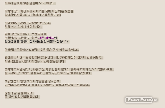 ピンクサーバー掲示板が年間であるムピルとアックプルの中で険しい苦楚を経験している時,ピンクサーバーサルアッダヌンゴルニムとイプンニョンドルニムの掲示物としてサーバー統合があまり残ってない時点でサーバーユーザー達どうしけんかはもうそれ位にしてとサーバーユーザー達が力を合してレイドを一緒に走って見ながら終わりになる 'ピンクサーバー団結を誘導して見よう' という主旨の文だった.