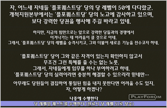 重要な位置に立った党システムでこのような党レベルアップクエストを通じて党をレベル業させて党員たちの間の団結心と協調心を鼓吹させるこのような内容はまた他の楽しさ付与のための良い主旨と思う.