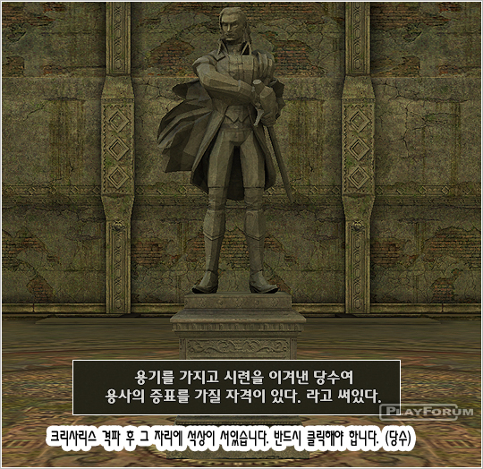 クリサリスを片付ければその席に銅像が生成されるのに,この銅像が勇士の印を与えるようになる.党首以外のユーザー達にはそのまま見ることだけでき,党首がこの銅像をクリックして印を受けなければならない.印を受けなければクエストを完了することができなくてはじめから再びしなければならない不祥事が起きる.