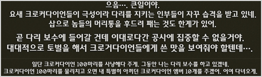 ワニの脅威クエストは繰り返し遂行が可能です.そのレベルの狩り場として別にメリットがないという予想を壊して 84 アイテムたちも何種類かドロップをしたし,周りに落ちるアップグレードインスタントアイテム(オーブ)たちの効果によって狩りは容易な方でした.