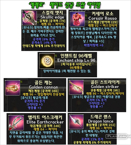 ユーザー達が一番気になる点でもあったボスモンスター 'GUERRERO' のドロップアイテムに対する情報です.ボスモンスターらしく 'GUERRERO' レイド成功の時にほとんど 100%の確率で 90レベル制限のアイテムをドロップして 92.96 エンチャントチップ,ベレムの箱,80レベルアイテム,84 レベルエリートアイテムをドロップしました.