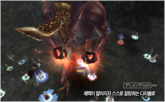 他のフィールドボスモンスターと違うように体力が 180万位に低いDIABLOだが広域範囲攻撃スキルのひんぱんな使用とヒーリングスキルによって組織的な団合が必要なことで見えます.